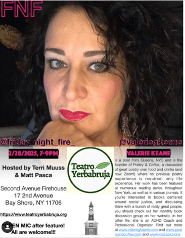 Valerie G. Keane is honored to be part of the Queens literary scene. Her work has been published in Newtown Literary Journal and she is the founder of Poetry & Coffee, a discussion group for writers and readers of all levels of experience where people are reading and talking about poetry for the joy of it. Valerie has been featured at numerous reading series in Queens, the International Women Artists’ Salon, and the NYC Poetry Festival. She speaks at high schools and colleges about how to love poetry from the bottom of your soul without an MFA, and she currently serves on the editorial review board for poetry for Newtown Literary. Find out more at www.valeriegkeane.com.